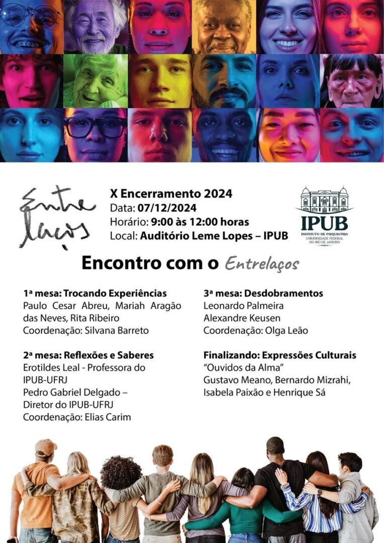 Neste próximo sábado, 07/12/24, acontecerá o evento de encerramento do ano de 2024 do Programa Entrelaços, do IPUB/UFRJ, com depoimentos de integrantes dos grupos comunitários, apresentação cultural dos integrantes do Grupo 15 de Nós e Mentes em Ação e palestras, convidando neste ano os professores, Pedro Gabriel Delgado e Erotildes Leal.